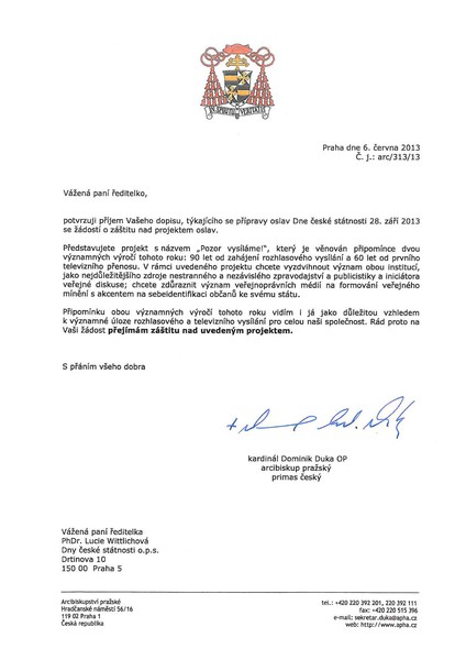 Je nám velkou ctí, že záštitu nad novým projektem pro rok 2013 převzal kardinál Dominik Duka. Jedná se zároveň o první, veřejně deklarovanou, podporu ze strany významné osobnosti České republiky.